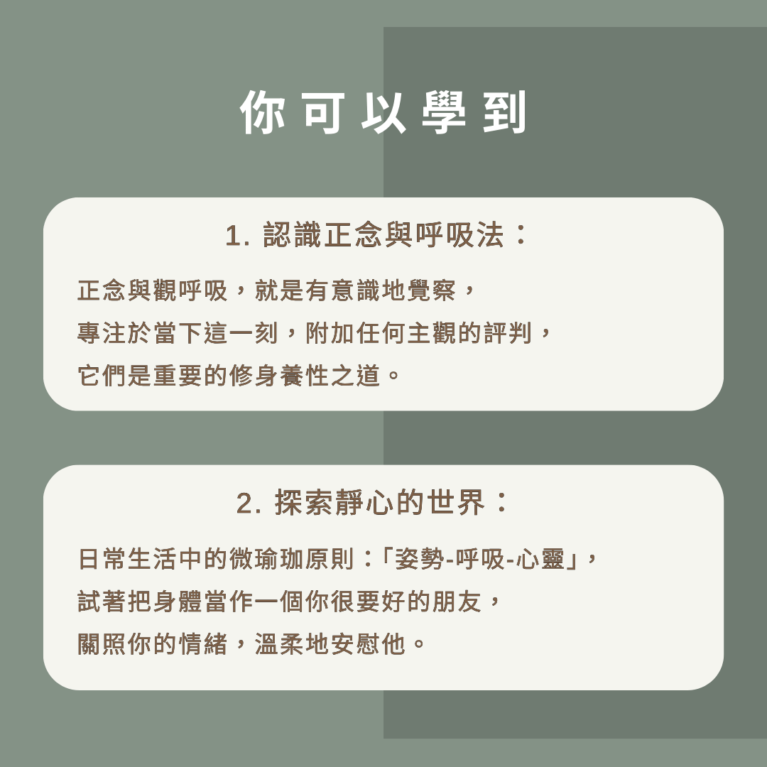 2.探索靜心的世界:日常生活中的微瑜珈原則:「姿勢-呼吸-心靈」,試著把身體當作一個你很要好的朋友,關照你的情緒,溫柔地安慰他。