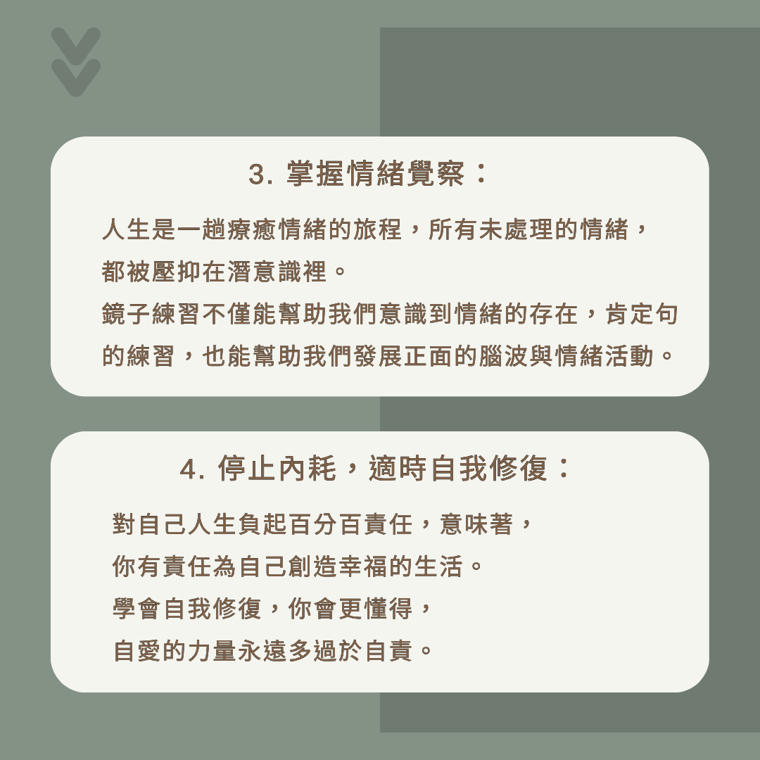 3.掌握情緒覺察:人生是一趟療癒情緒的旅程,所有未處理的情緒,都被壓抑在潛意識裡。鏡子練習不僅能幫助我們意識到情緒的存在,肯定句的練習,也能幫助我們發展正面的腦波與情緒活動。
